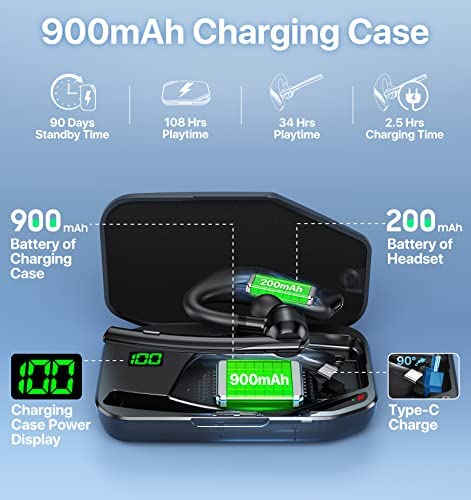 🎧【900mAh Charging Case & 108H Playtime】With 900mAh battery LED charging case, you will get totally 108hrs playing/talking time. The noise cancelling headset with microphone can be fully charged just on 2.5H, it can be used about 34 hours of continue talk/music time. Bluetooth earpiece can be charged with charging case or directly TYPE-C charge cable(included) for your preference. No need worry lost charging case result in can’t charging for headset.